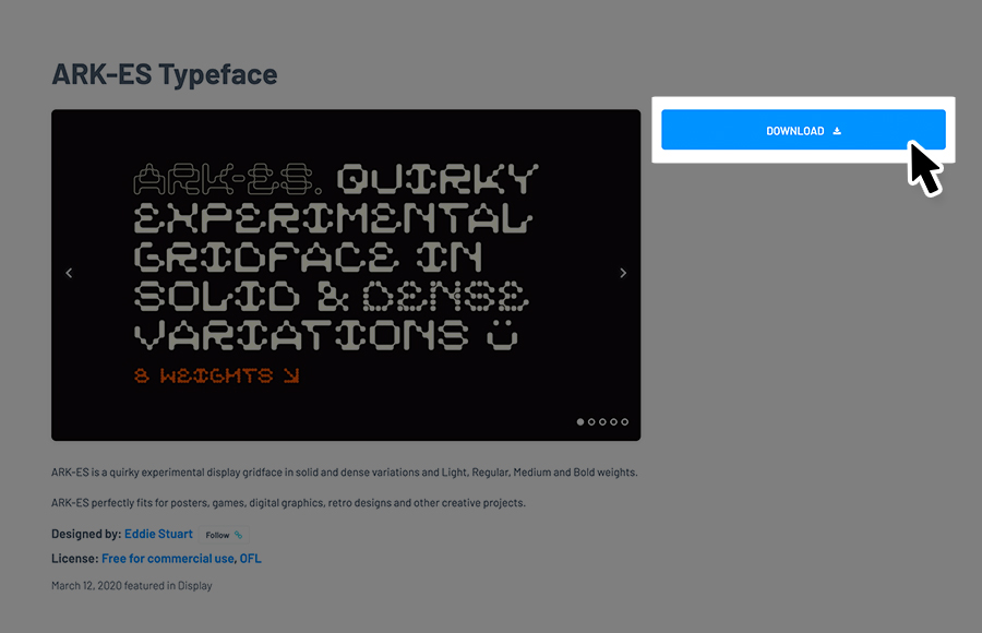 角ばったピクセルが連結して作られるデザインが、レトロゲームや近未来的なUIを連想させ、画面上で強い視覚的インパクトを放つユニークな作りとなっているフォントです。