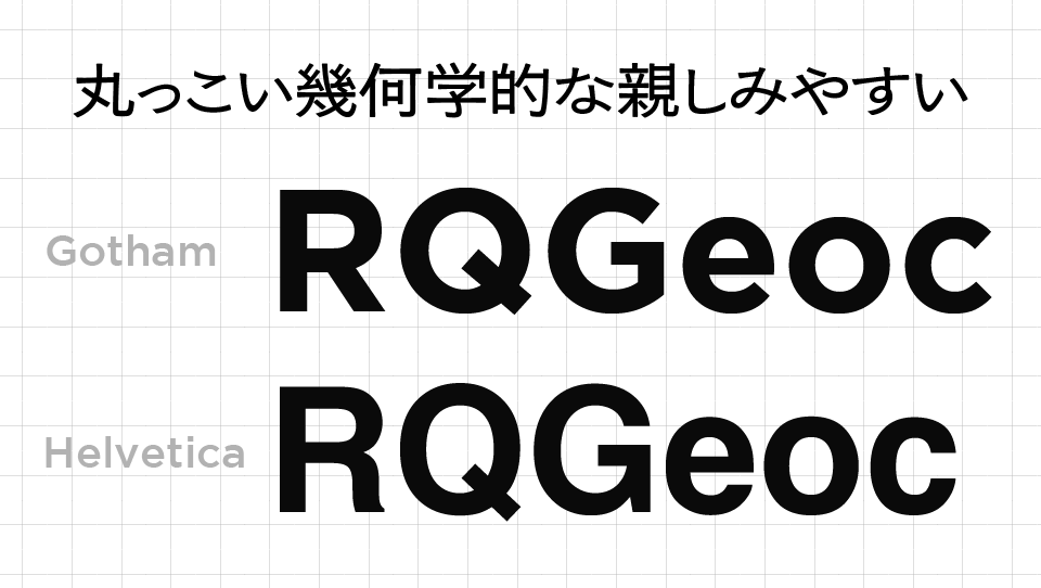 Helveticaと比べるとわかるように、「R」の足が直線的に伸びていたり、「Q」「G」など幾何学的に丸く作れらているので、可愛らしく親しみやすいです。